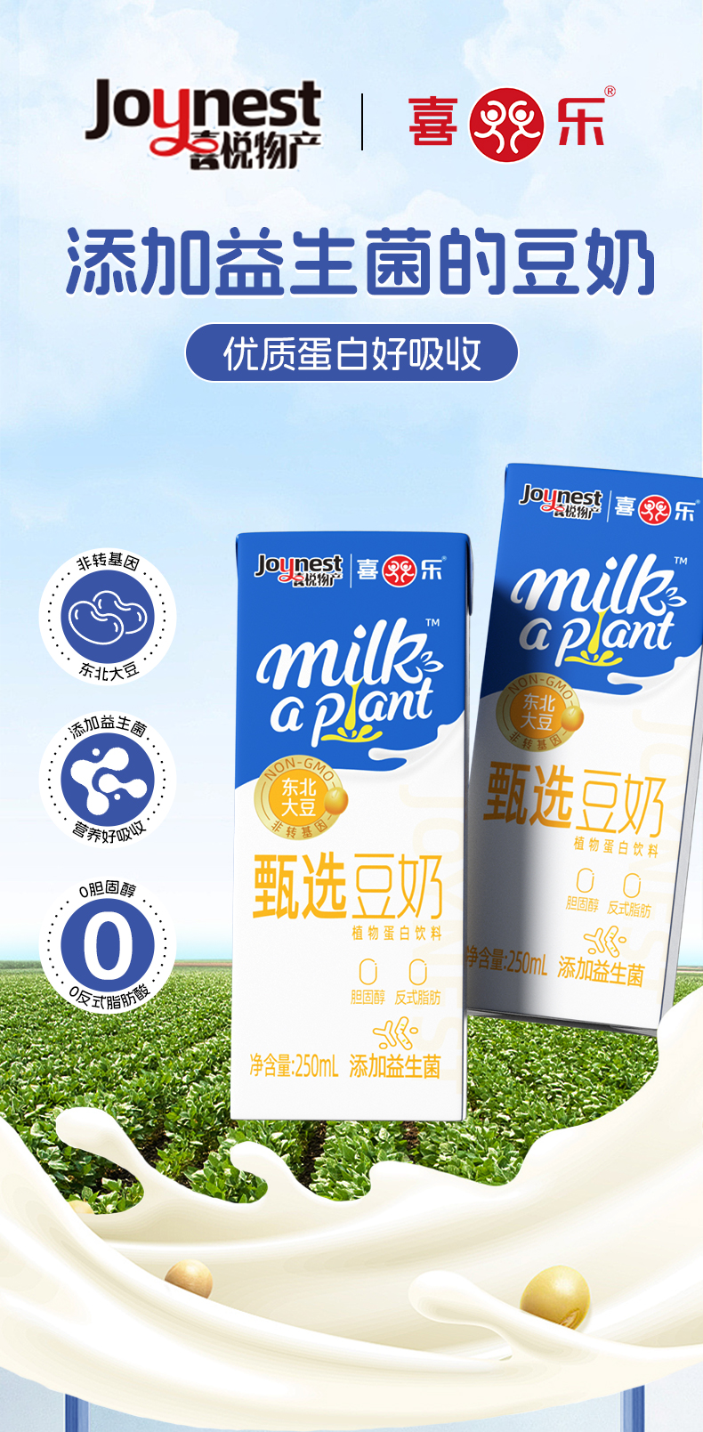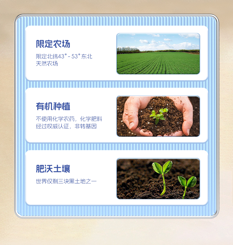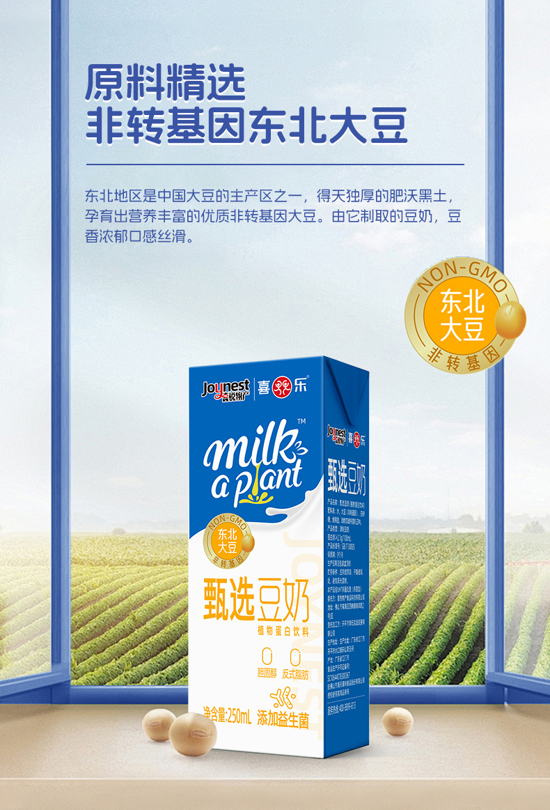 原料精選非轉基因東北大豆:東北地區是中國大豆的主產區之一,得天獨厚的肥沃黑土,孕育出營養豐富的優質非轉基因大豆。由它制取的豆奶,豆香濃郁口感絲滑。