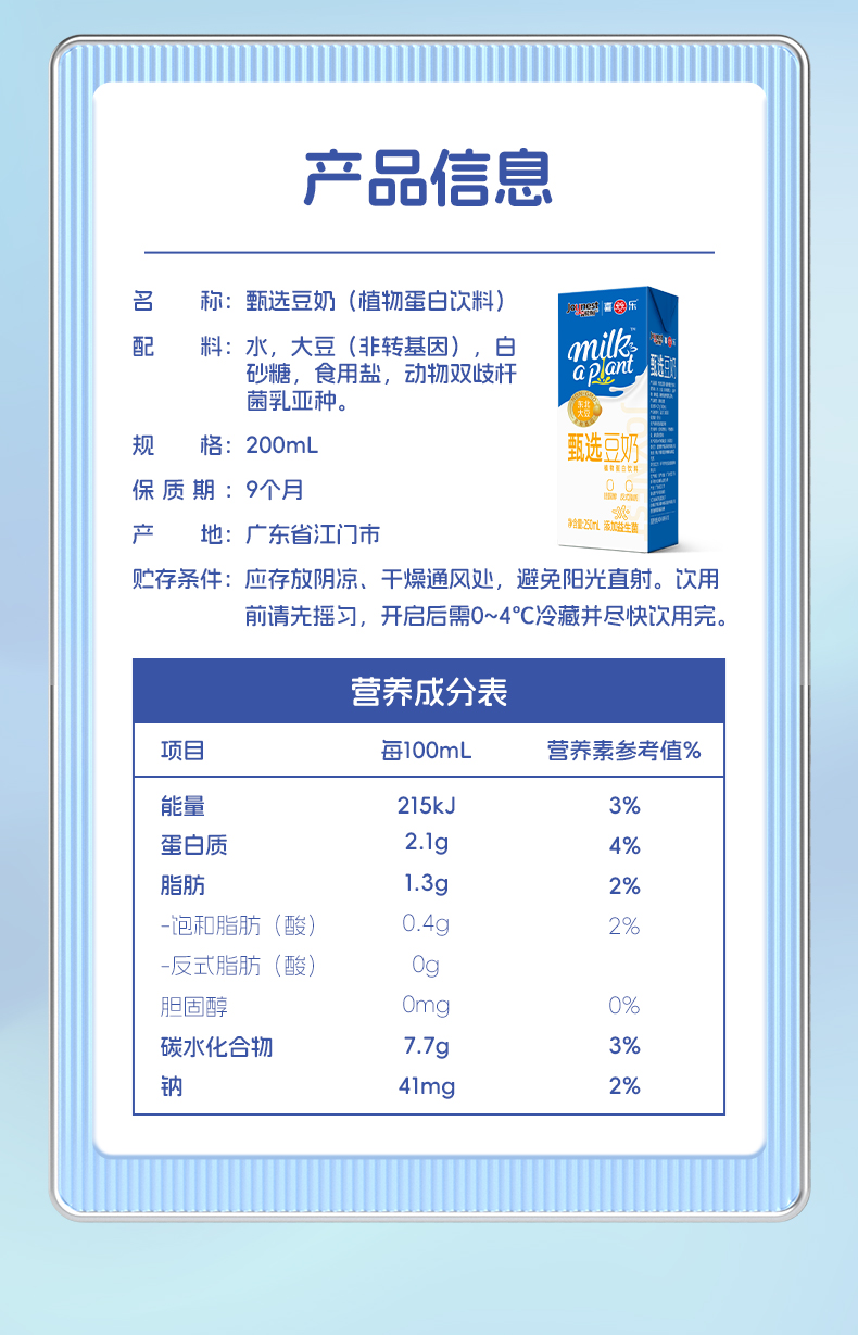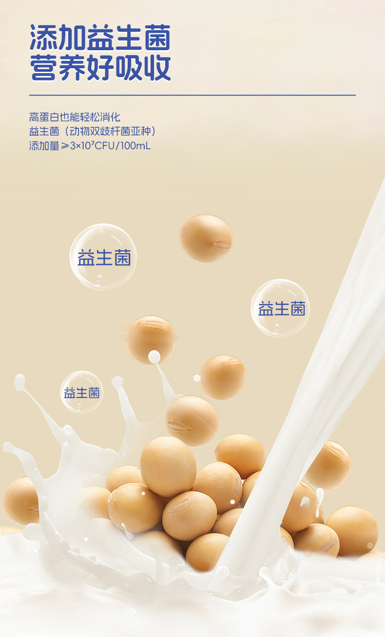 添加益生菌,營養好吸收:高蛋白也能輕松消化、益生菌(動物雙歧桿菌亞種)、添加量≥3×10?CFU/100mL。