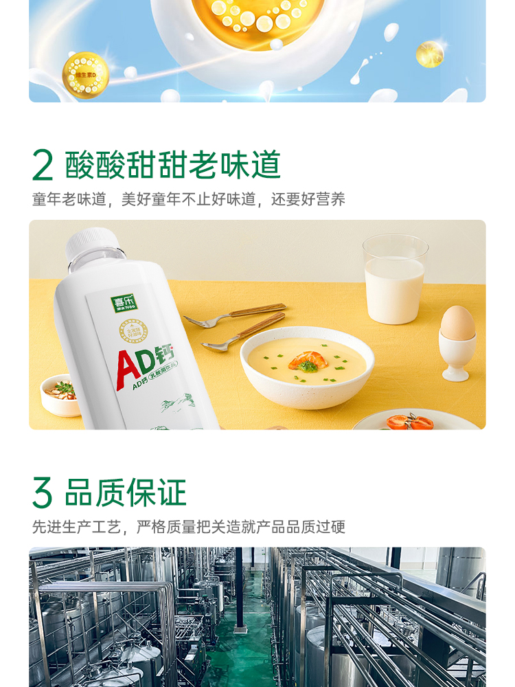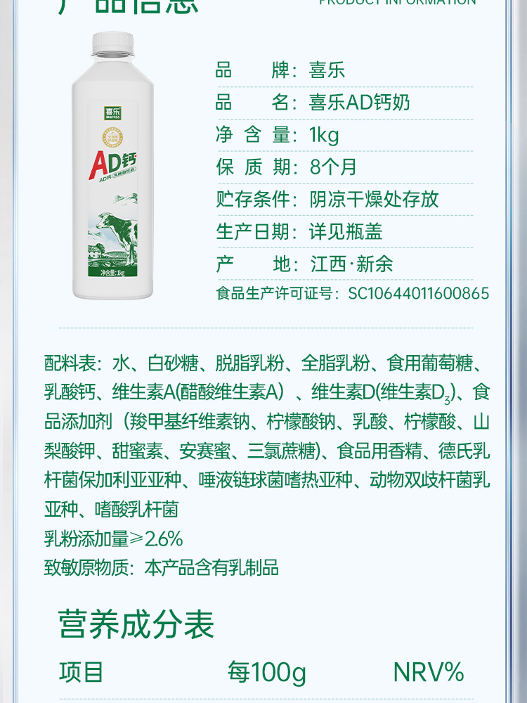 營養成分:添加維生素A(有促進生長、繁殖,維持骨骼、視力等多種生理功能)、維生素D(促進鈣、磷吸收,皮膚細胞生長分化及調節免疫功能),添加鈣